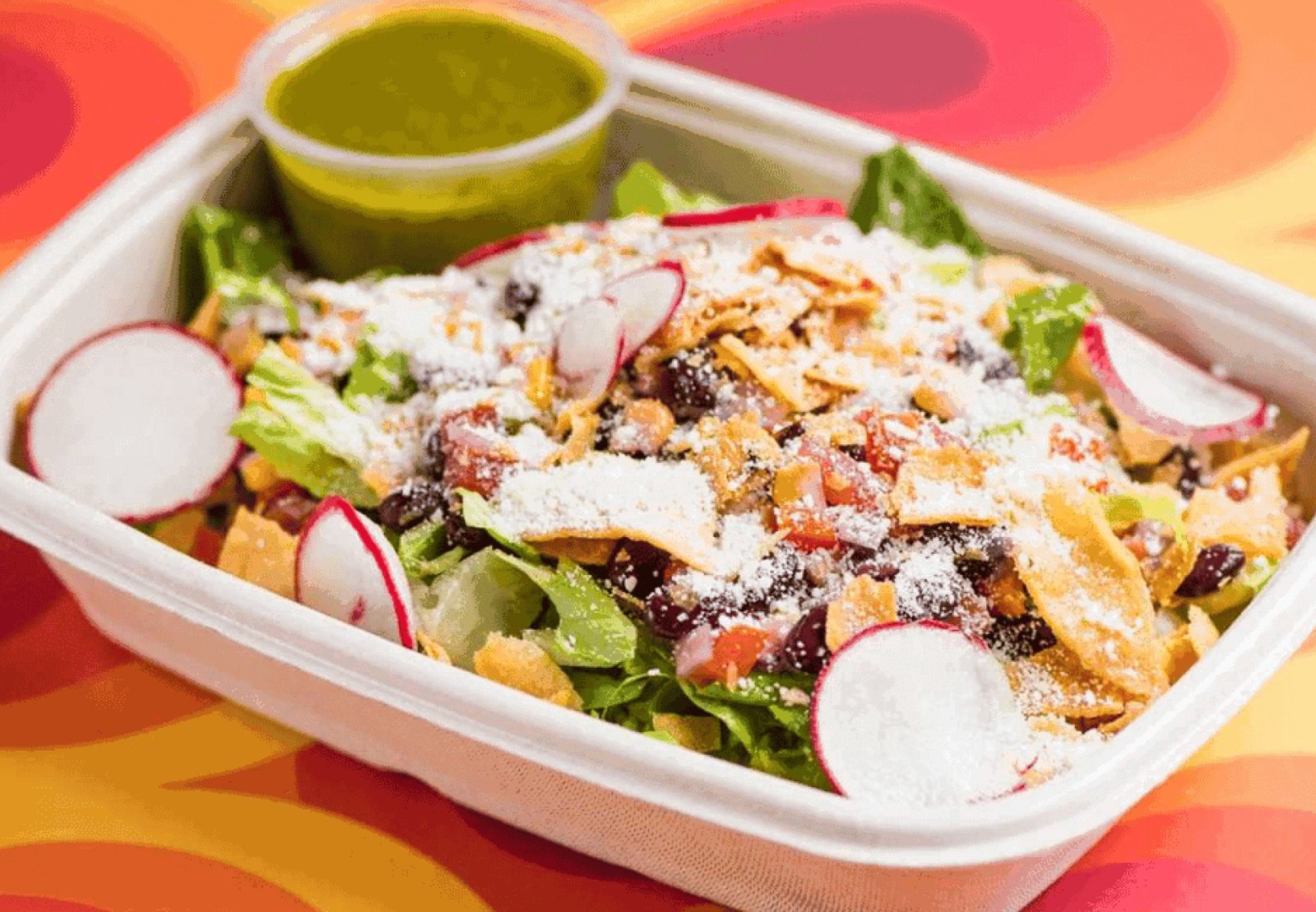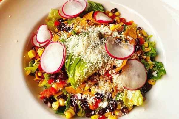Everything you need to build your own taco salad is included, including lettuce, your choice of up to 2 proteins or vegetables, Jack cheese, radish, pickled jalapeno, cilantro, pico de gallo, crema, onion, poblano verde salsa, and chipotle salsa.