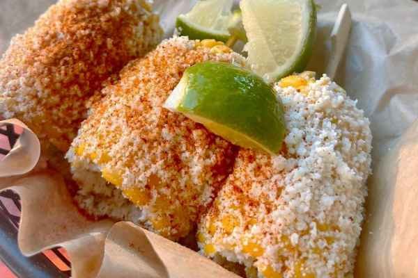 A savory dish of sweet corn drizzled with mayo, cotija cheese, chili…