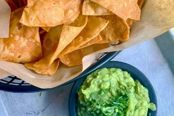A basket of fresh corn tortilla chips with savory guacamole.