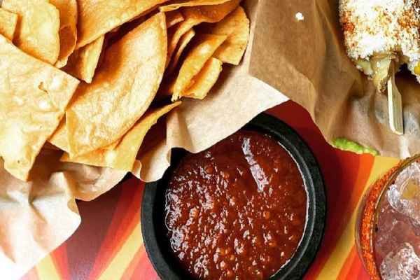 A basket of fresh corn tortilla chips with savory tomato salsa.